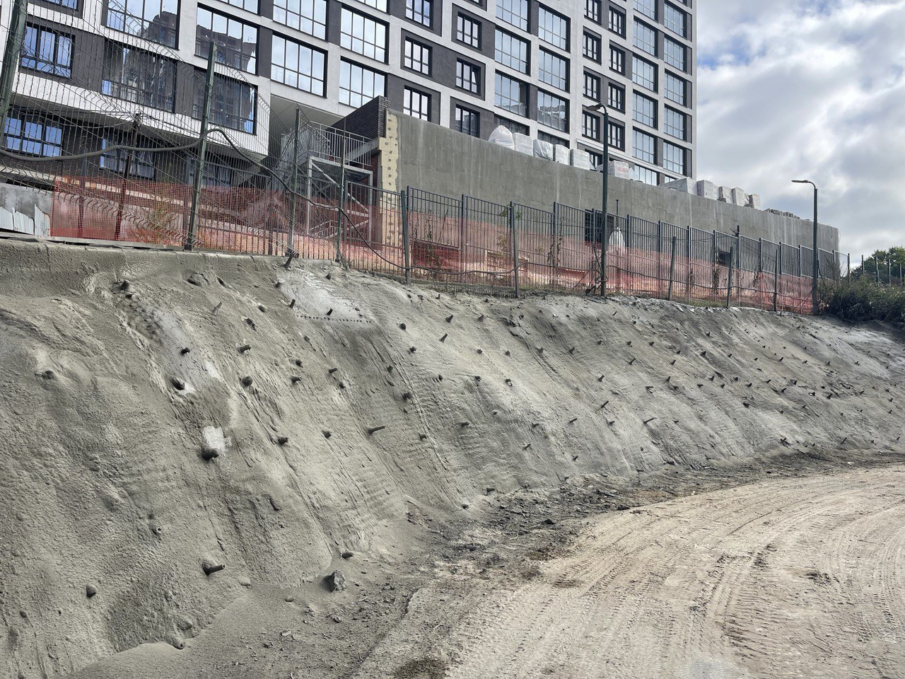 Для обеспечения проезда к строящемуся корпусу в стесненных условиях требовалось выполнить укрепление откоса под пешеходным переходом, защитить от сползания и размыва на длительный срок. Выбрано решение защитить откос торкретбетоном.